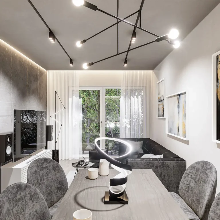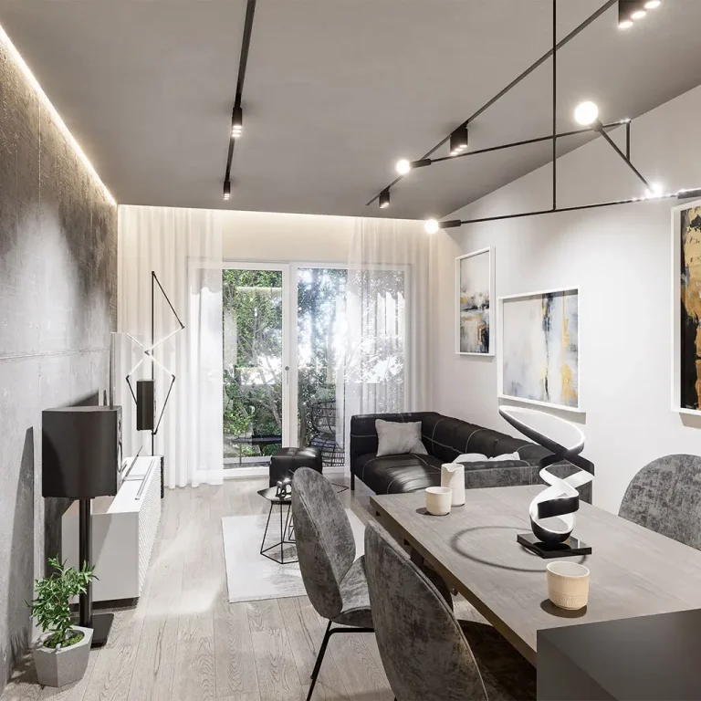 Prezentowane wizualizacje pokazują przykładową aranżację wnętrz. Oferta sprzedaży obejmuje lokal w stanie deweloperskim i nie zawiera mebli, zabudowy ani wyposażenia. Grafiki i rysunki mają charakter poglądowy i informacyjny – nie stanowią oferty w rozumieniu Kodeksu cywilnego. Wymiary pomieszczeń, balkonów oraz rozmieszczenie instalacji zostały opracowane na podstawie projektu budowlanego. W trakcie realizacji inwestycji mogą wystąpić nieznaczne różnice, wynikające z technologii wykonania i przebiegu prac budowlanych.