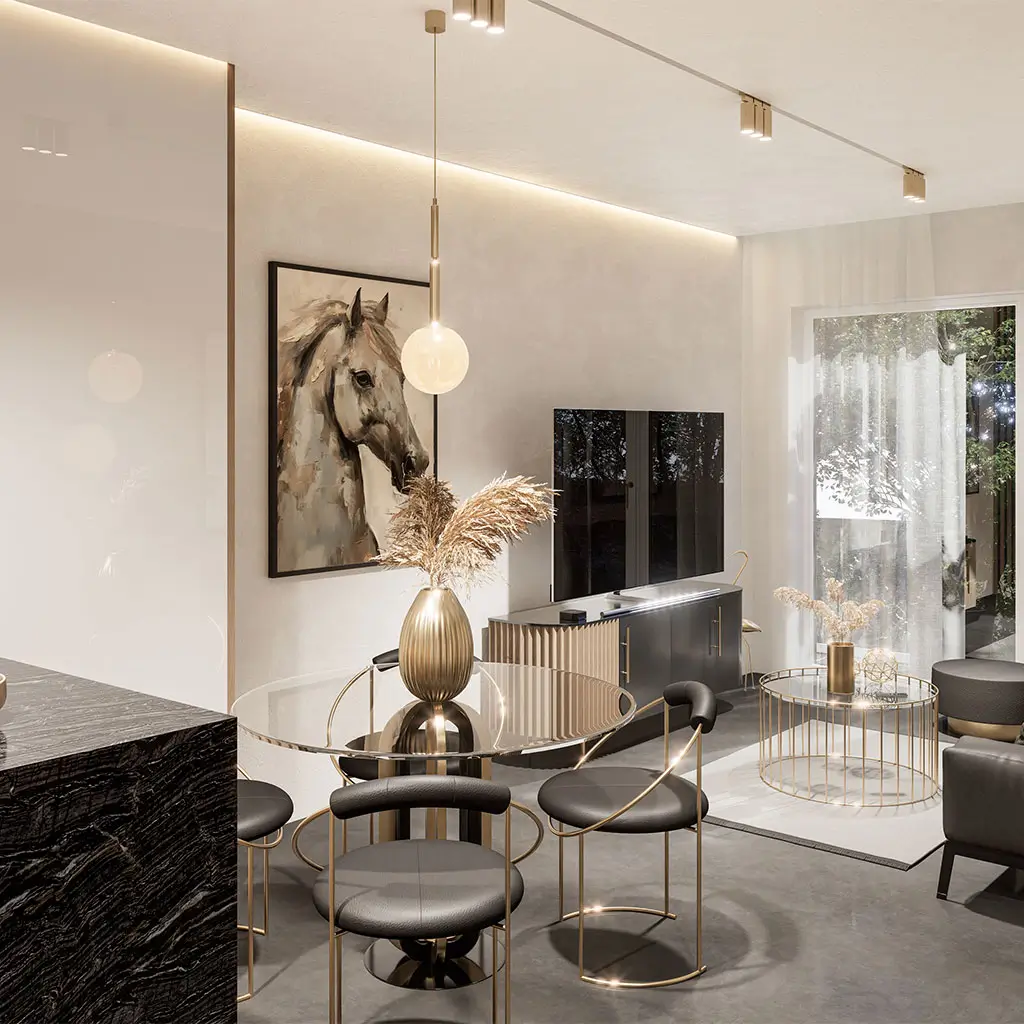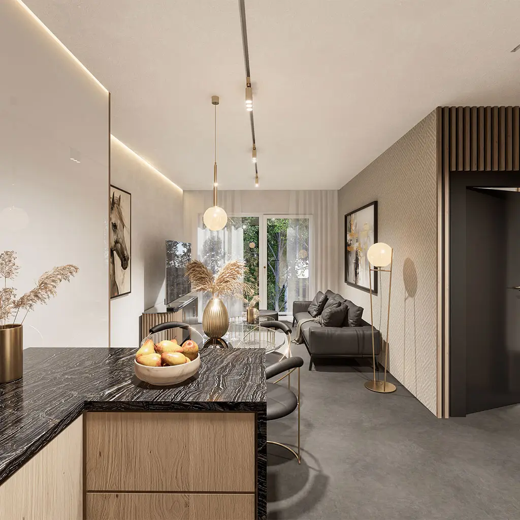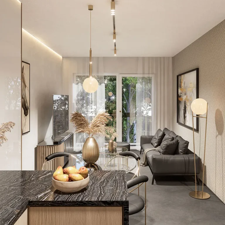 Prezentowane wizualizacje pokazują przykładową aranżację wnętrz. Oferta sprzedaży obejmuje lokal w stanie deweloperskim i nie zawiera mebli, zabudowy ani wyposażenia. Grafiki i rysunki mają charakter poglądowy i informacyjny – nie stanowią oferty w rozumieniu Kodeksu cywilnego. Wymiary pomieszczeń, balkonów oraz rozmieszczenie instalacji zostały opracowane na podstawie projektu budowlanego. W trakcie realizacji inwestycji mogą wystąpić nieznaczne różnice, wynikające z technologii wykonania i przebiegu prac budowlanych.