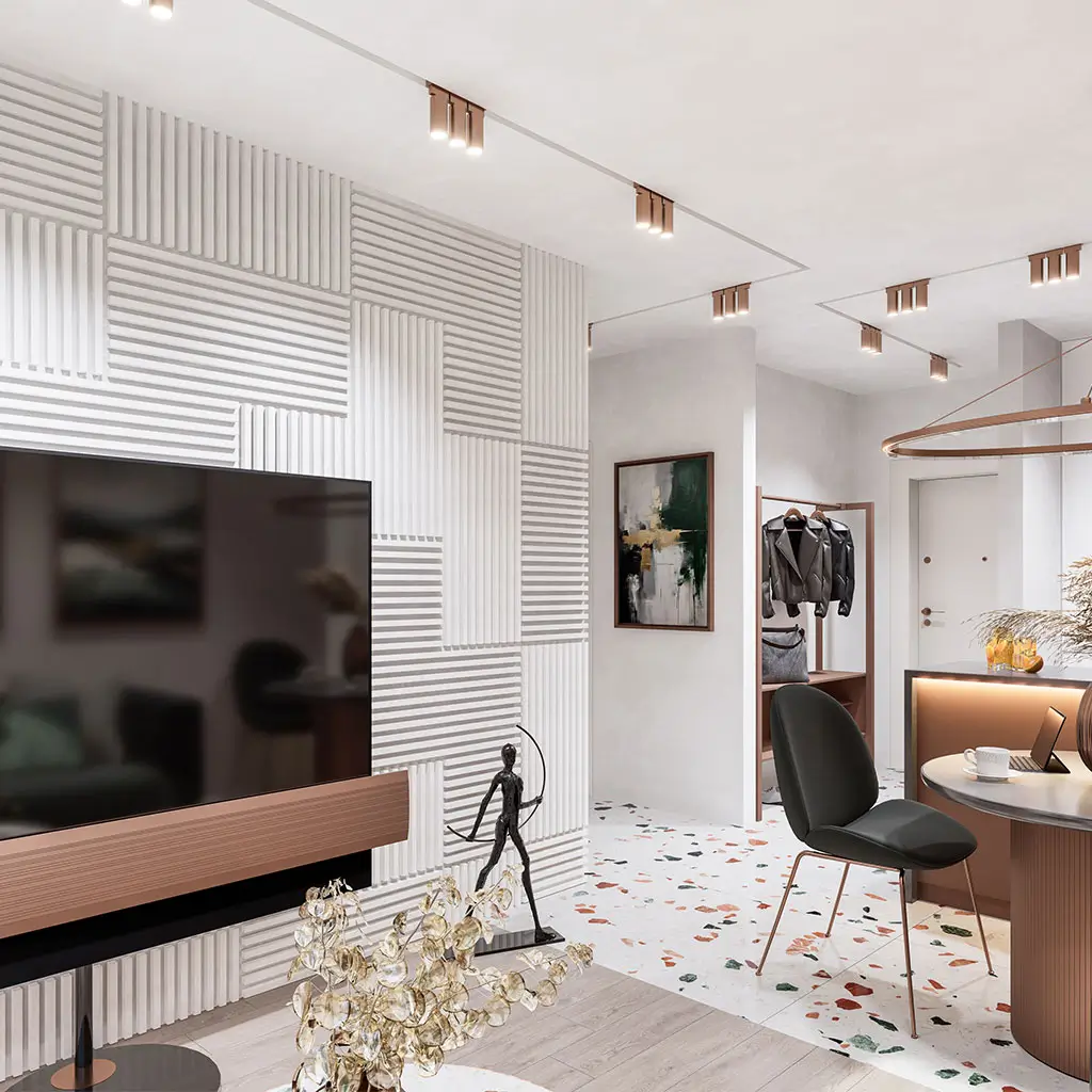 Prezentowane wizualizacje pokazują przykładową aranżację wnętrz. Oferta sprzedaży obejmuje lokal w stanie deweloperskim i nie zawiera mebli, zabudowy ani wyposażenia. Grafiki i rysunki mają charakter poglądowy i informacyjny – nie stanowią oferty w rozumieniu Kodeksu cywilnego. Wymiary pomieszczeń, balkonów oraz rozmieszczenie instalacji zostały opracowane na podstawie projektu budowlanego. W trakcie realizacji inwestycji mogą wystąpić nieznaczne różnice, wynikające z technologii wykonania i przebiegu prac budowlanych.