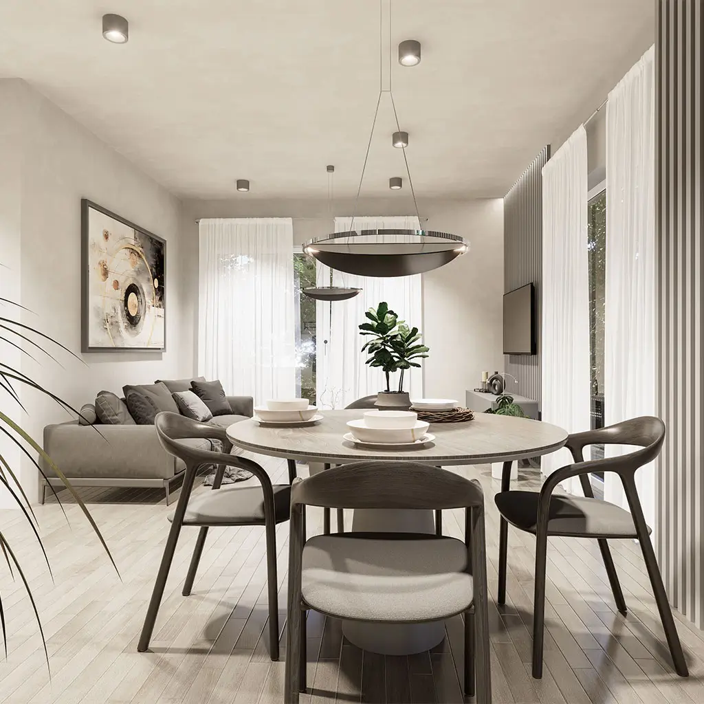 Prezentowane wizualizacje pokazują przykładową aranżację wnętrz. Oferta sprzedaży obejmuje lokal w stanie deweloperskim i nie zawiera mebli, zabudowy ani wyposażenia. Grafiki i rysunki mają charakter poglądowy i informacyjny – nie stanowią oferty w rozumieniu Kodeksu cywilnego. Wymiary pomieszczeń, balkonów oraz rozmieszczenie instalacji zostały opracowane na podstawie projektu budowlanego. W trakcie realizacji inwestycji mogą wystąpić nieznaczne różnice, wynikające z technologii wykonania i przebiegu prac budowlanych.